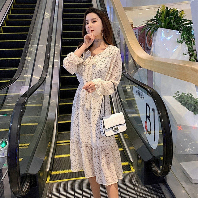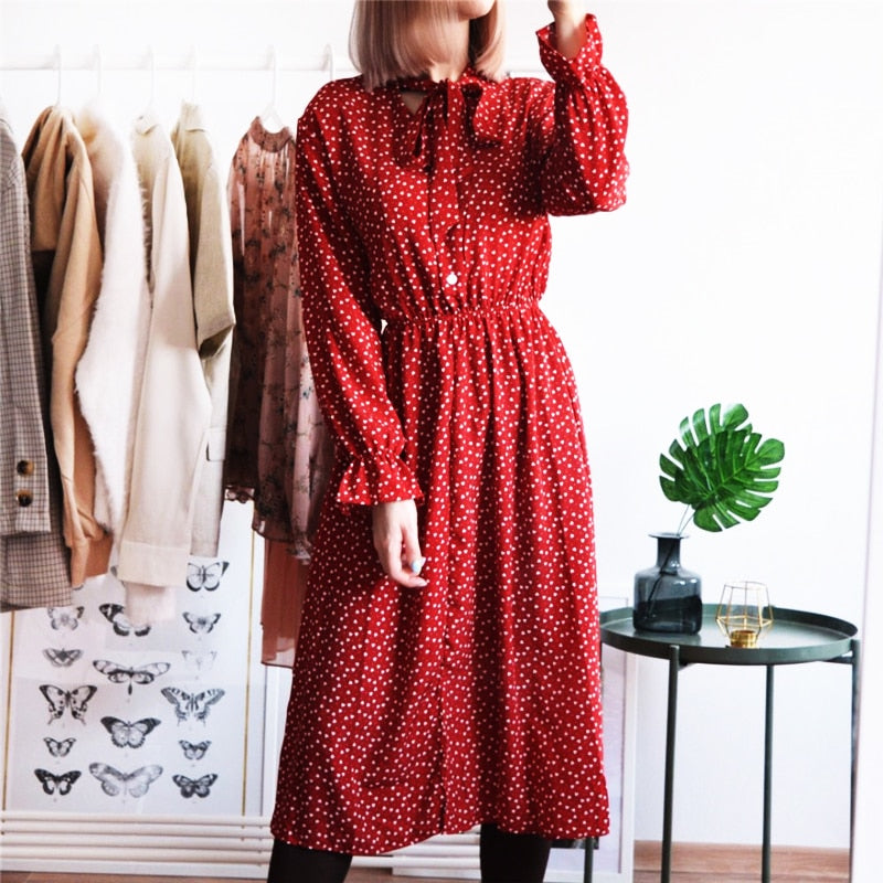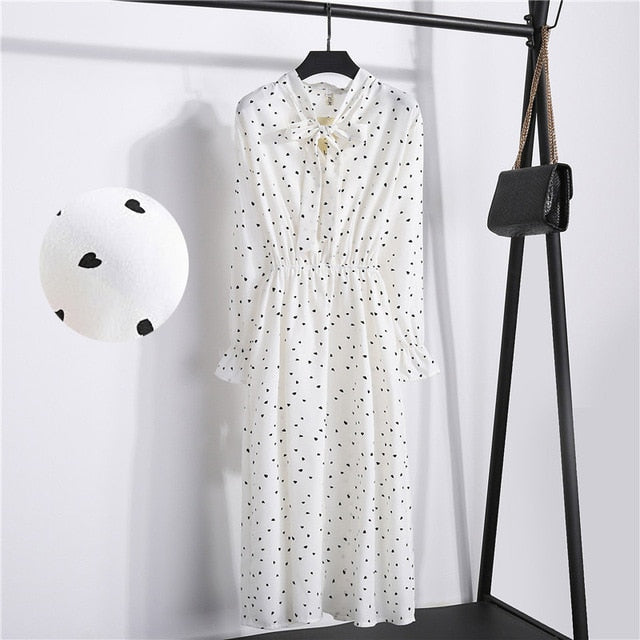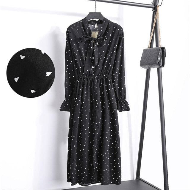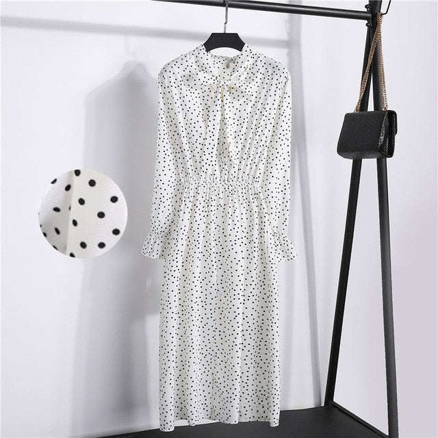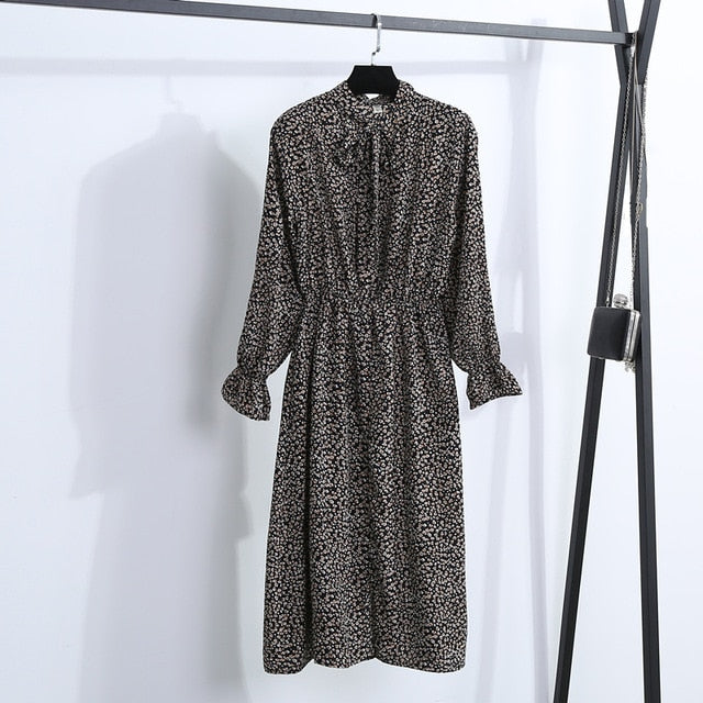 Women Print Chiffon Dress Casual Female Elastic Wasit Keen Length Dress Vintage Ruffles Long Sleeve Chic Button Ladies Dress